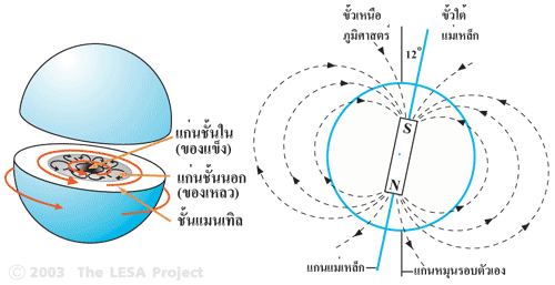 แกนแม่เหล็กของโลกมีขั้วเหนือ-ใต้ เอียงทำมุม 12 องศา กับแกนเหนือ-ใต้ทางภูมิศาสตร์ซึ่งโลกหมุนรอบตัวเอง สนามแม่เหล็กของโลกมิได้มีลักษณะเป็นทรงกลมสมมาตร เนื่องจากอิทธิพลของลมสุริยะ (Solar wind) ซึ่งประกอบด้วยอนุภาคโปรตอน อิเล็กตรอน และอนุภาคชนิดอื่น เคลื่อนที่จากดวงอาทิตย์เข้าหาโลกด้วยความเร็ว 450 กิโลเมตร/ชั่วโมง อนุภาคเหล่านี้มีความเร็วเหนือเสียง เมื่อกระทบเข้ากับสนามแม่เหล็กโลก ก็จะเกิดช็อคเวฟ (Shock wave) และลดความเร็วลง การปะทะกันเช่นนี้ทำให้เกิดการไหลเวียนของอนุภาคตามเส้นแรงแม่เหล็กซึ่งล้อมรอบโลก (Magnetosphere) อนุภาคบางส่วนถูกกักขังไว้ในเส้นแรงแม่เหล็ก ใน แถบ ฟาน อัลเลน (Van Allen belts) สองชั้นซึ่งอยู่สูงเหนือพื้นผิวโลกประมาณ 2,000 5,000 กิโลเมตร และ 13,000 19,000 กิโลเมตร แถบชั้นในเต็มไปด้วยอนุภาคโปรตอนพลังงานสูง ส่วนแถบชั้นนอกเป็นอนุภาคโปรตอนและอิเล็กตรอนพลังงานต่ำ ลมสุริยะมีคุณสมบัติเป็นตัวนำไฟฟ้าที่ดีเยี่ยม เมื่อมันเคลื่อนที่ผ่านสนามแม่เหล็กโลก จะทำให้เกิดอนุภาคโปรตอนและอิเล็กตรอนความเร็วสูง เคลื่อนที่ในแนวเหนือ-ใต้ และเมื่ออนุภาคเหล่านี้พุ่งชนบรรยากาศชั้นบนของโลก อะตอมของก๊าซจะปลดปล่อยแสงสว่างออกมา เกิดเป็น แสงเหนือ หรือ แสงใต้ (Aurora) ในบริเวณรอบขั้วแม่เหล็กโลก