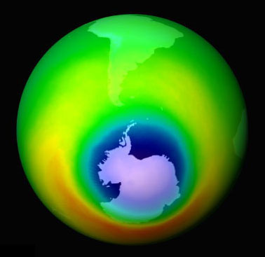 ภาพถ่ายดาวเทียมแสดงช่องโอโซนเหนือทวีปแอนตาร์คติก บริเวณขั้วโลกใต้