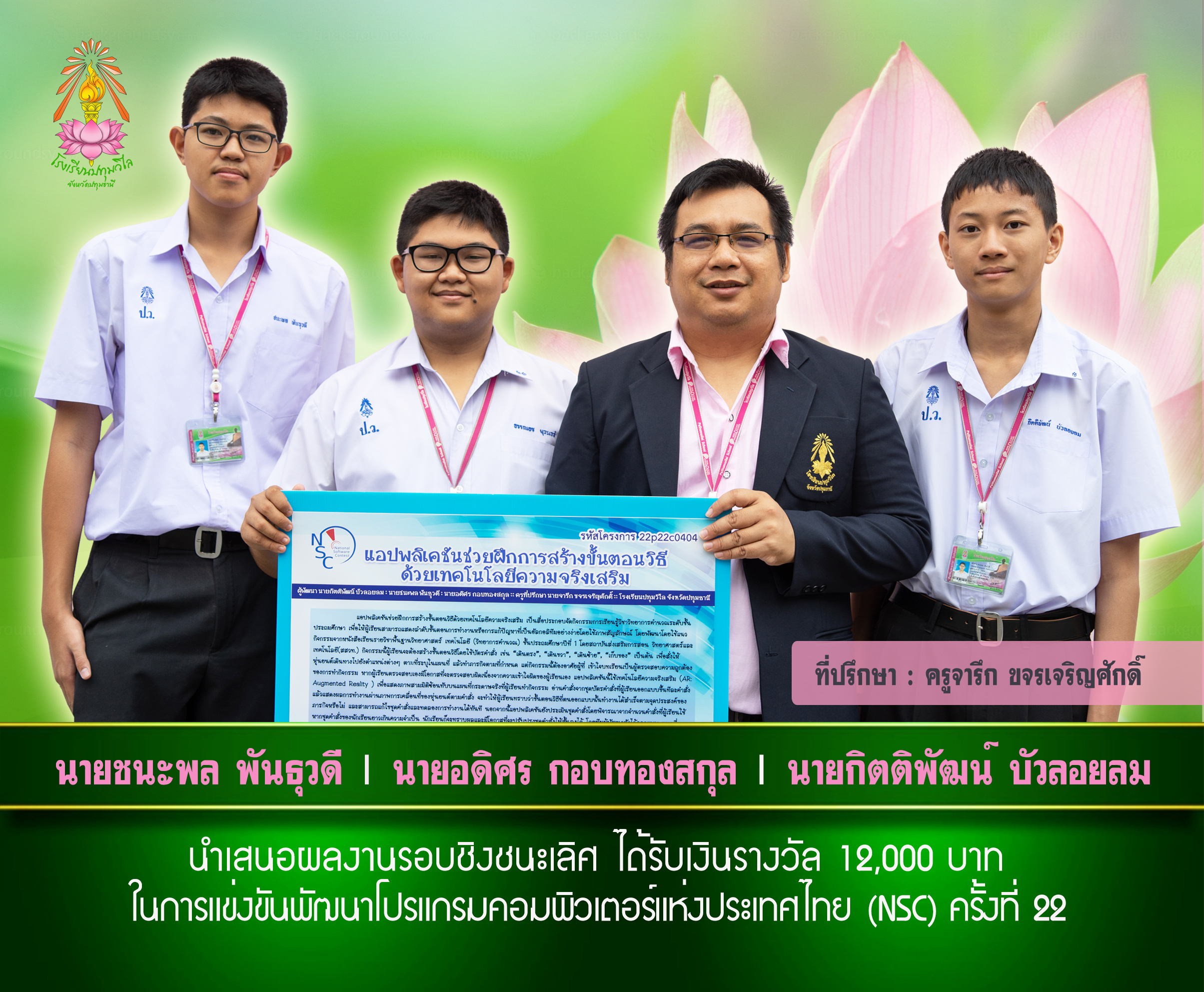 นำเสนอผลงานรอบชิงชนะเลิศ ได้รับเงินรางวัล 12,000 บาท ในการแข่งขันพัฒนาโปรแกรมคอมพิวเตอร์แห่งประเทศไทย (NSC) ครั้งที่ 22 นายชนะพล พันธุวดี นายอดิศา กอบทองสกุล นายกิตติพัฒน์ บัวลอยลม ครูที่ปรึกษา ครูจารึก ขจรเจริญศักดิ์