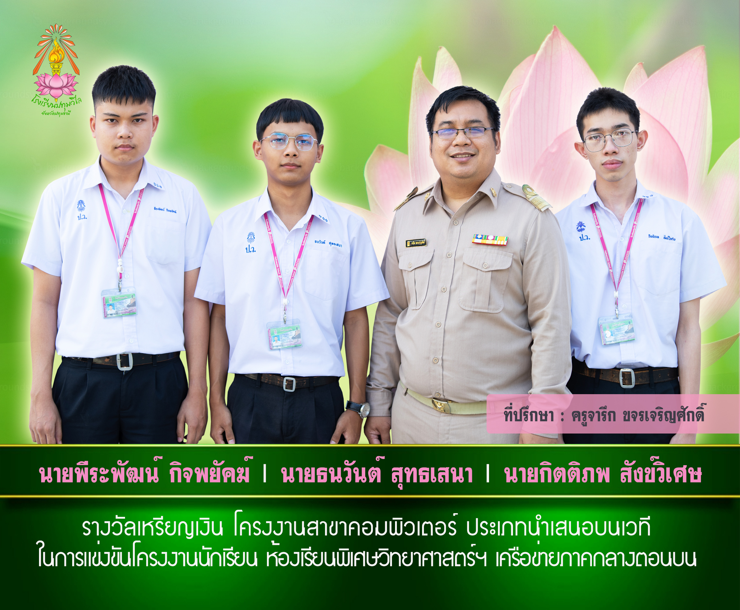 นายพีระพัฒน์ กิจพยัคฆ์ นายธนวันต์ สุทธเสนา นายกิตติภพ สังข์วิเศษ รับรางวัลรองชนะเลิศอันดับ 1 การแข่งขันพัฒนาโปรแกรมคอมพิวเตอร์แห่งประเทศไทย (NSC) ครั้งที่22 ครูที่ปรึกษา ครูจารึก ขจรเจริญศักดิ์