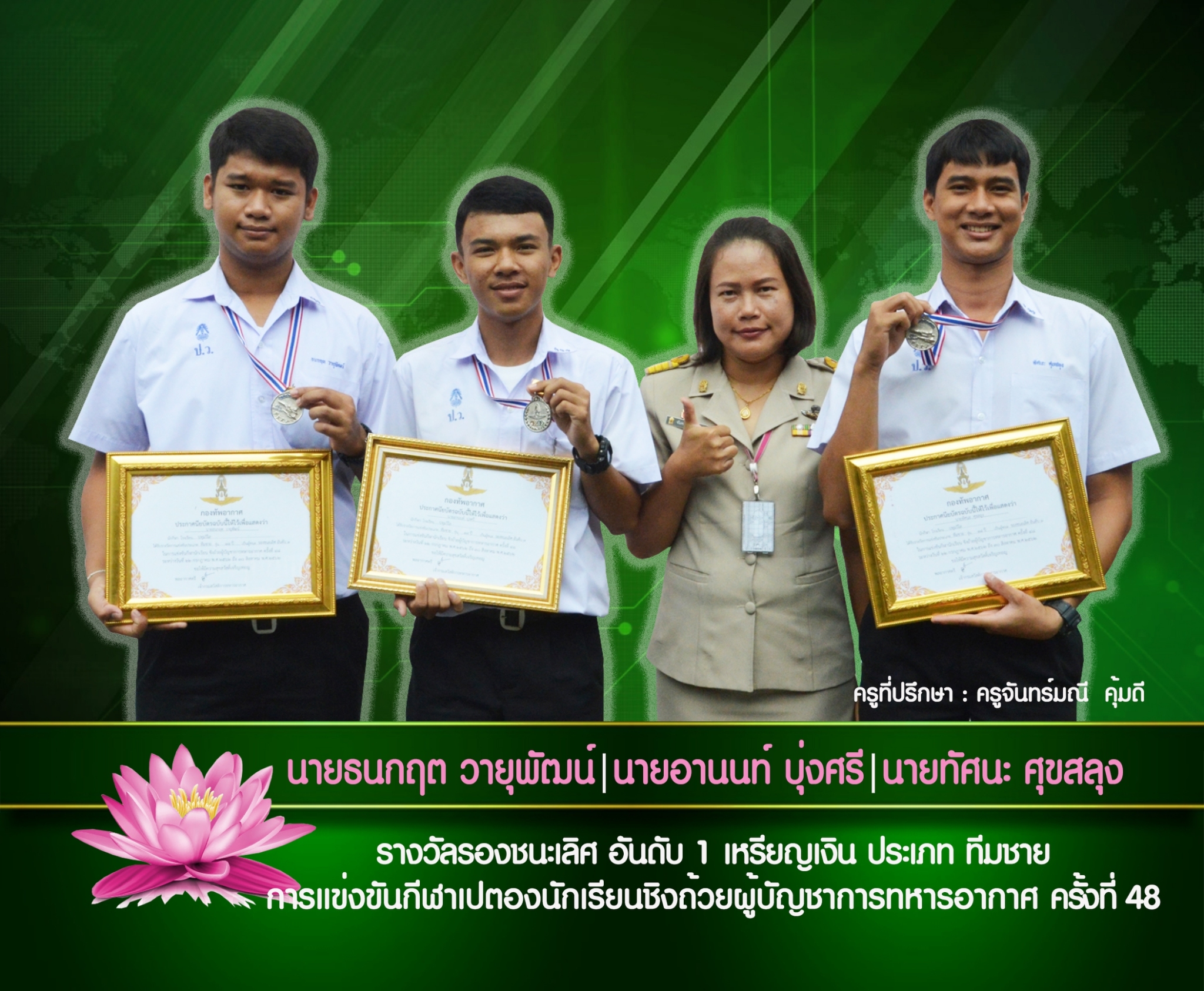 นายธนกฤต วายุพัฒน์ นายอานนท์ บุ่งศรี นายทัศนะ ศุขสลุง ครูที่ปรึกษา ครูจันทร์มณี คุ้มดี