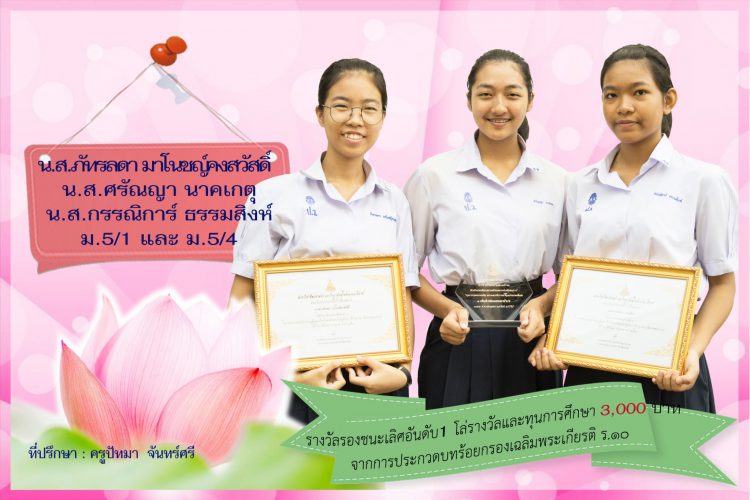 โล่รางวัลและทุนการศึกษา 3,000 บาท จากประกวดบทร้อยกรองเฉลิมพระเกียรติ ร.10